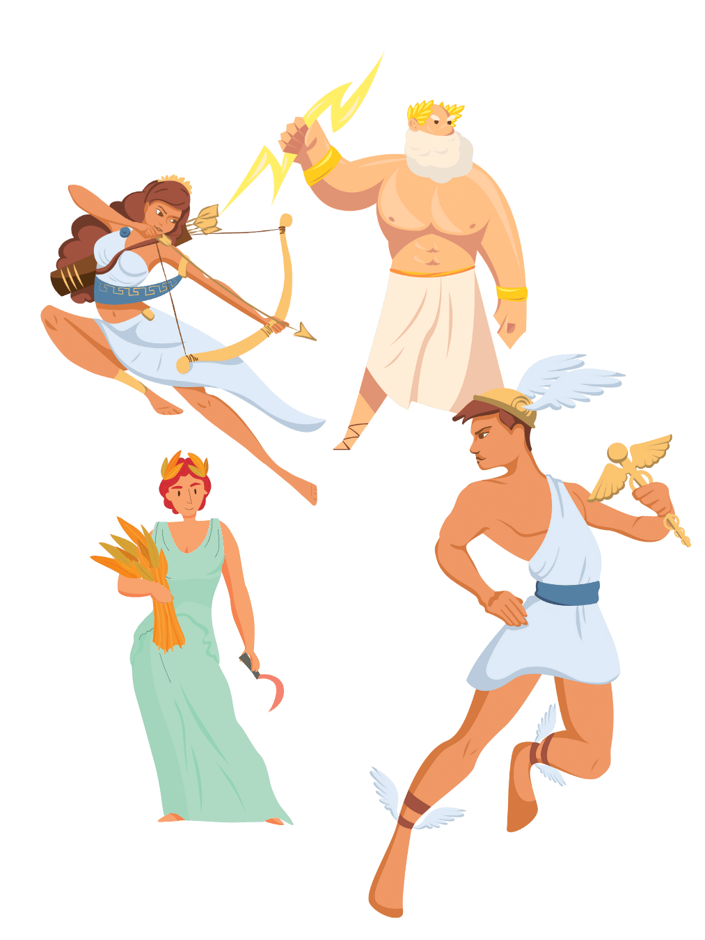 Cuando el viento sopla fuerte, aparece Eolo, el dios de los vientos, que juega con las velas del barco y guía nuestro rumbo. Si el cielo se oscurece y escuchamos truenos, es Zeus, el poderoso dios del rayo, quien nos recuerda su fuerza desde lo alto. Y cuando el sol brilla con intensidad, es Helios, el dios del sol, quien nos acompaña en su carro dorado cruzando el firmamento.